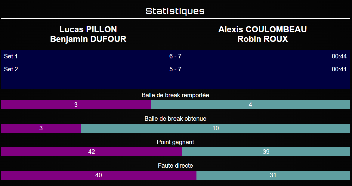 La druga runda Mecz wznawiany jest na tym samym poziomie. Wczesne przełamanie Pillon/Dufour, natychmiast przerwane. Wymiany stają się napięte, przełamania i ich powtórzenia następują jedno po drugim, a obie drużyny grają łeb w łeb, aż do... 5/5.